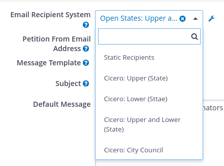 Your first option is to choose the recipient system. You can choose a set of static recipients (e.g. a governor or CEO) or you can choose to dynamically lookup the signer's elected officials using the options you have configured via the electoral extension.