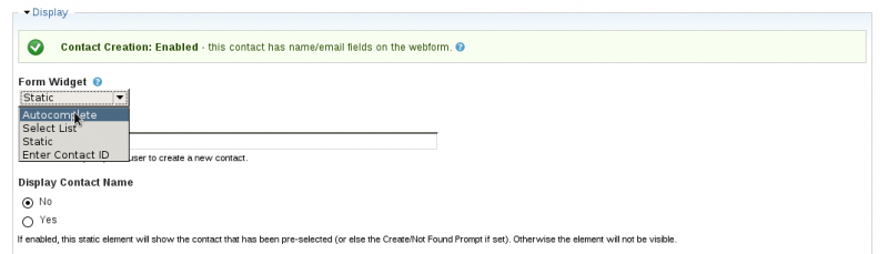 Choose the contact fields you want to appear.Existing Contact is a special case! That allows you to select a contact that already exists in your database to update. It's a useful feature if you are creating a webform for staff or volunteers to fill out however if you are making a public webform be sure to uncheck that field.