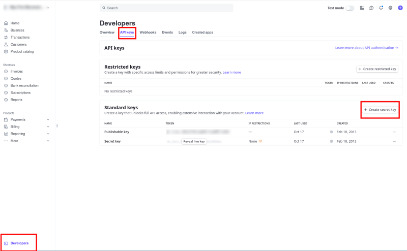 Then, click the "View Test Data" toggle and repeat these steps to record your test keys: